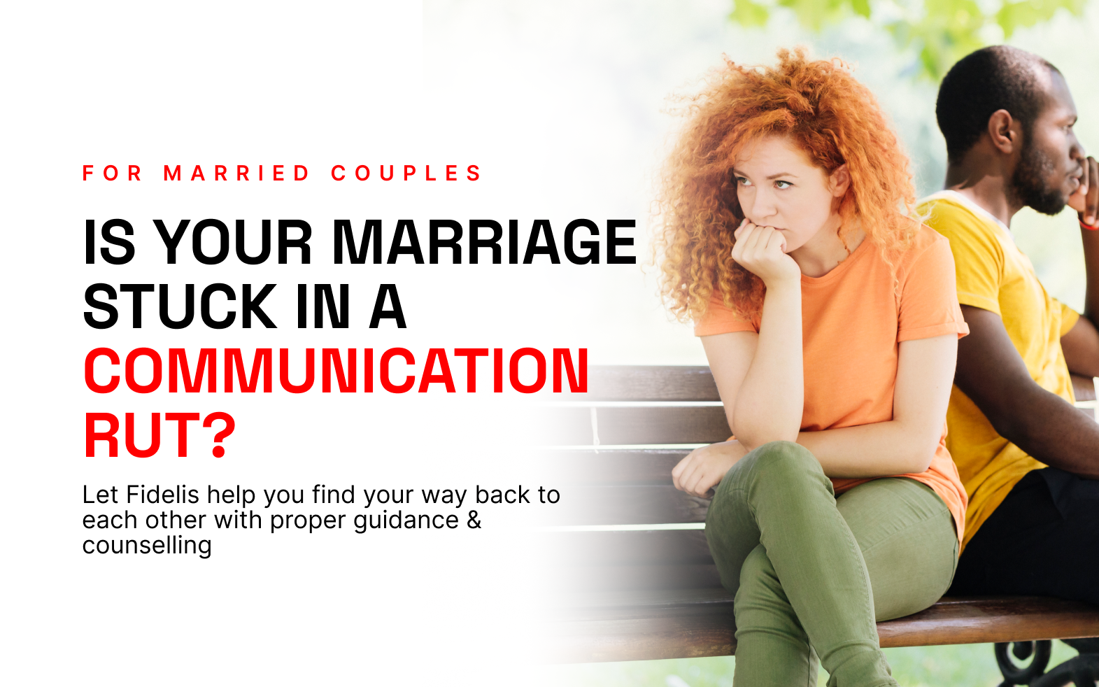 Let Fidelis help you restore your relationship. Using proven counseling techniques, we’ll address your unique challenges, improve communication, and strengthen your emotional bond. Together, we’ll create the understanding and connection you’re looking for in your marriage.